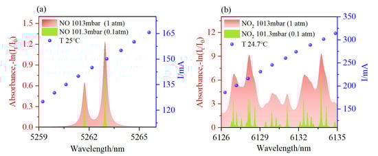 For NO and NO2 molecules, there is a strong line strength in the mid infrared band. In this study, the transitions of NO at 5261.7233 nm, 5261.7235 nm, 5261.7237 nm, 5261.7254 nm, 5261.7256 nm, and 5261.7259 nm were selected based on the HITRAN database. However, because the wavelengths of these six groups were close and exceeded the resolution of the QCL bandwidth, they could be regarded as one group of absorption lines. Similarly, the transitions of NO2 at 6131.1097 nm and 6131.1232 nm were selected, and they were regarded as one group of absorption lines. Figure 2 shows the two gas absorption spectra. The data were derived from the HITRAN 2012 database and calculated for pressures of 1013 mbar (1 atm) and 101.3 mabr (0.1 atm), respectively, at room temperature and with an optical path length of 70 cm [33]. These spectral lines of the gases were selected to avoid the strong spectral lines of other gases, such as H2O and CO2, thus reducing the impact of cross-absorption. The relationship between the wavelength and driving current of the laser at the selected temperature is shown in Figure 2. This was measured by using a wavelength meter, and the wavelength range was able to cover the target wavelength. The drive currents of the lasers for NO and NO2 were 145 mA and 260 mA, respectively. The scanning frequency was 10 Hz.