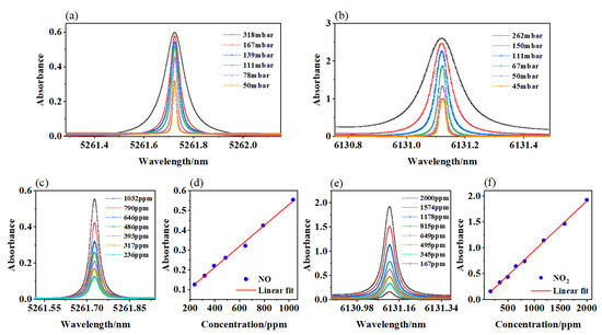 Direct absorption signals at different pressures: (a) NO signals; (b) NO2 signals. (c) The different direct absorption signals of NO. (d) Linear fit between the peak values and concentrations. (e) The different direct absorption signals of NO2. (f) Linear fit between the peak values and concentrations.