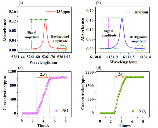 Meanwhile, the detection limits of the system were found by calculating the signal-to-noise ratio of the absorption signals. As shown in Figure 4a,b, the NO concentration was 236 ppm and the signal-to-noise ratio was 22.5, so the detection limit of 10.5 ppm was calculated. Similarly, the NO2 concentration was 167 ppm and the signal-to-noise ratio was 11.4, so the detection limit of 14.6 ppm was calculated. During the experiments, we recorded the relationship between the measured data and time, as shown in Figure 4c,d. We defined the response time of the system according to when the measured value reached 90% (T90) of the set value; this was T90 = 2.3 s for NO and T90 = 2 s for NO2.