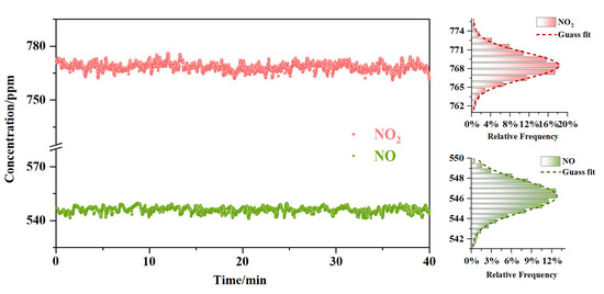 For the purpose of analyzing the system’s stability, a mixed gas, consisting of both NO and NO2, was used to fill the absorption cell at a flow rate of 0.2 L/min; the concentration of NO was 545 ppm and that of NO2 was 770 ppm. The concentration data were continuously measured for 40 min, and the results are shown in Figure 5. From the relative histograms of each dataset, which are shown on the right side of Figure 5, it can be seen that the measurement results had a good Gaussian fit. Thus, the standard deviations of NO and NO2 were 1.57 ppm and 2.67 ppm, respectively. It is worth noting that the experiment described in this paper was intended to verify the feasibility of measuring the NOx conversion process. If we would like to achieve a higher accuracy and a lower measurement limit, a longer optical path or cavity ring-down spectroscopy (CRDS) and off-axis integrated cavity output spectroscopy (OA-ICOS) could be used based on the QCL technology [34,35,36].