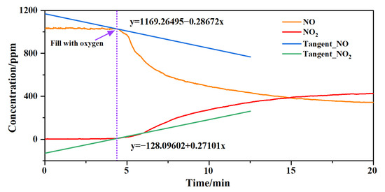 The next experiment was carried out to verify that the system could monitor the changes in gas concentrations during a chemical reaction. The system was set up by filling it with NO gas at 1032 ppm: the gas flow rate was 0.2 L/min, the NO concentration was stable at 1032 ppm, and the concentration of NO2 was 0. After waiting for a period of time, O2 was used to fill the cell at the time indicated by the purple dotted line. It was found that when O2 was added, it immediately reacted with NO to produce NO2. NO was consumed in the reaction: its concentration decreased and the concentration of NO2 increased, as shown in Figure 6. Due to the slow gas flow, the limitation of the container’s volume and insufficient gas contact, the reaction speed slowed down after a period of time, and the reduction in the NO concentration and the increase in the NO2 concentration tended to become gentle. However, chemical reactions were still slowly occurring. Because the system maintained a dynamic state of intake and exhaust, NO and O2 remained present. Therefore, NO was not completely consumed in the reaction, and the concentration did not drop to 0. By analyzing the data, it was found that when O2 was used to fill the container, the chemical reaction occurred rapidly, and the measured concentrations of the two gases also changed immediately. This was sufficient to prove that the system could quickly monitor the changes in gas concentrations when the reaction began. Two tangent lines were obtained at the inflection points of the two concentration–time curves, as shown in Figure 6, where the NO concentration started to decrease and the NO2 concentration started to increase. The ratio of the slopes of the two tangent lines was 1.058. With reference to the chemical reaction equation (2NO + O2 → 2NO2), the rate at the beginning of the reaction had a certain correlation with the chemical formula, which was close to a 1:1 replacement. Therefore, the system was able to meet the requirements of simultaneous and rapid measurement of changes in gas concentrations during chemical reactions or the evolution of an atmospheric environment.