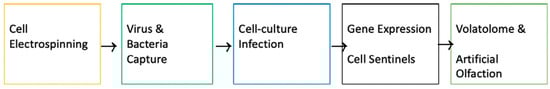 Cell electrospinning has been demonstrated successfully as have organs on chip configurations. Modeling the direct electrospinning of live cells in fibrous scaffolds and design-optimized mat architectures for tailored efficiency in capturing the pathogens in air is required. It is also possible to tune the transduction modes to obtain a visible signal (color or bending). The novel nanotechnology tools described above are expected to offer highly sensitive and selective detection of pathogens through the output signal of the live cell-biosensors. Several novel transduction mechanisms may also be explored, such as optical and chemo-mechanical mechanisms.