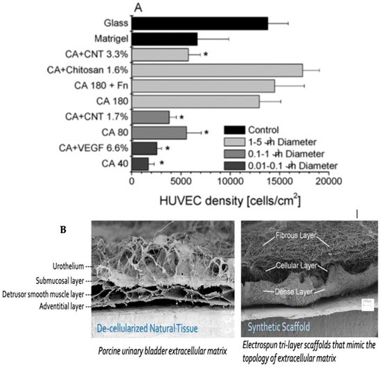 (A) The cell density on the glass coverslip, or within the scaffold; * cell density differs from on glass [11]; (B) left: the natural scaffold (ECM); right: synthetic scaffold [4].