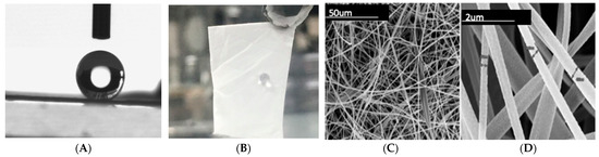 Super-water-repellant cellulose acetate electrospun mats for filtration applications [15]: (A) water contact angle on CA mat; (B) super-water-repellant nature of the CA mat; (C) low-magnification SEM image of the fibrous mat; and (D) high-magnification SEM image showing the fiber characteristics.