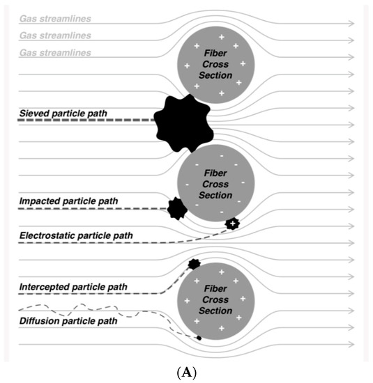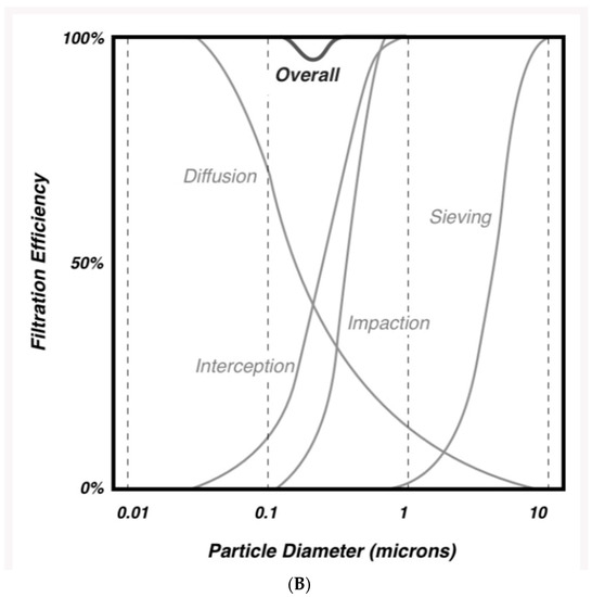 (A) Various phenomena involved in the filtration process using a fibrous membrane; (B) (virus) particle size vs. filtration efficiency (from [16]).