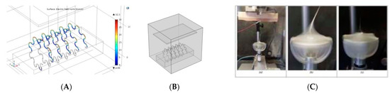 (A) COMSOL design of a novel spinneret and its characteristic electrostatic field; (B) schematic of the novel electrospinning setup; and (C) novel rotating collector that permits multiple fiber patterns—such as aligned vs. random—offering design choices for the living sensor arrays [3].