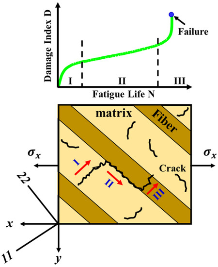 There are three regions in which failure mechanisms occur in composite structures: the matrix (I), matrix–fiber interface (II), and fiber (III). These are illustrated in Figure 2. Region I is distinguished by the coalescence of microcracks due to shear, which causes progressive damage over fatigue cycles. After that, the microcracks’ number and size increase with the number of cycles. Fatigue damage progresses to region II once the cracks approach the fibers along the matrix–fiber interface. The cracks grow in the direction of the fibers due to the normal stress and strain components and this also is responsible for delamination and then progression to region III, in which fiber breakage occurs, leading to fiber failure [31].