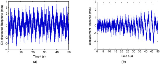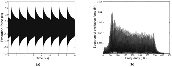 The ambient excitation force applied in this work is numerically simulated by MATLAB (−0.4~0.4 N) as shown in Figure 4a. Its frequency range is first detected at approximately 1–400 Hz. Its spectrum is shown in Figure 4b. The ambient excitation force is perpendicular to the wall of the pipe. Three damage levels are introduced, i.e., location: D1: 0.42–0.48 m, D2: 0.52–0.58 m, and D3: 0.62–0.68 m. It is assumed that all the damage occurs towards 180–360° and occurs at the pipe internal surface. The damage cases D1 and D2 have the same damage range with different locations and D3 has a greater damage range than both D1 and D2 combined (D1 + D2) [32,33,34].