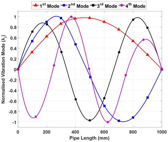 The 1st, 2nd, 3rd, and 4th frequency mode shapes of the intact pipeline are listed in Figure 5 and Table 2 for different damage cases (D0–D3).