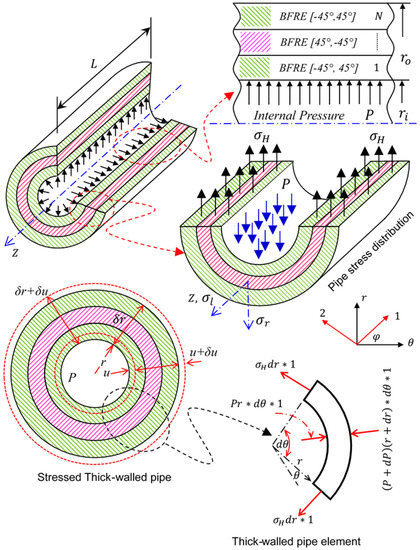 By solving the above differential equations and applying the general boundary conditions of the pipe in the stress equation, the stress components in the pipe (see Figure 6) can be expressed by: