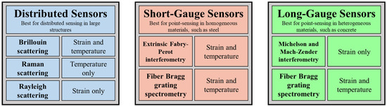 Selecting the correct FO sensor types to monitor the excitation forces applied to the structure is important for detection. Before examining the details of the working principle of FO, a concise review of the common types of FO sensors is provided. Among the common types of FO sensors, point sensors, and distributed sensors are of interest in the pipeline monitoring field. Figure 8 presents a classification of FO sensors based on guiding optical principles. These include distributed sensors for distributed sensing in large structures, short-gauge sensors for point-sensing in homogeneous materials, such as steel, and long-gauge sensors for point-sensing in heterogeneous materials, such as concrete.