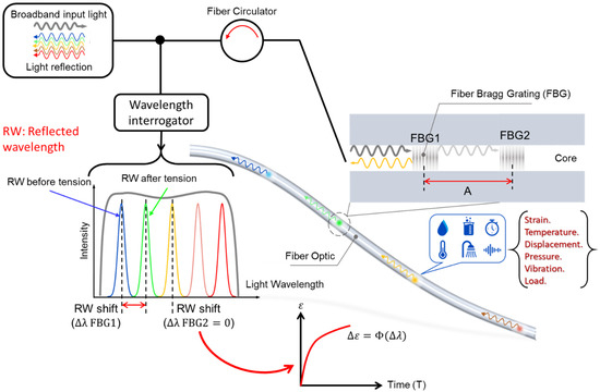 When the broadband light is projecting at an FBG, reflection at the FBG occurs. Some light with wavelengths that satisfy Bragg condition of Equation (10) is reflected, and the remaining light passes the grating: