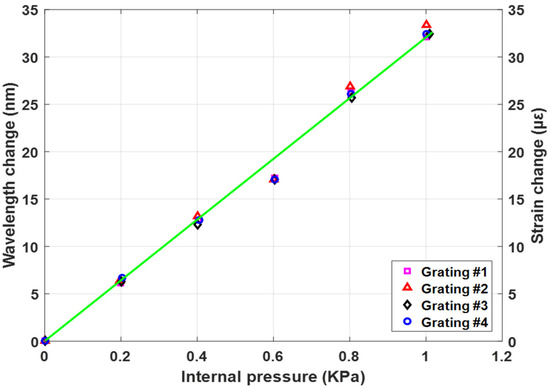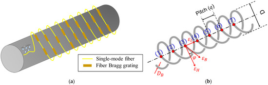 where is the Bragg wavelength, is the effective refractive index, and is the grating period. When strain is produced in an FBG, a proportional shift of the Bragg wavelength is expected to occur. To determine the strain easily, the change in wavelength is analyzed. This is the principle used detect the grating period change in FBG sensors due to stress variation; therefore, the stresses can be measured without noise influence and light intensity disturbance. The wavelength shift is proportional to the strain, and absolute strain can be measured by Equation (11):