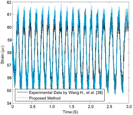 Comparison between the proposed method and experimental values of strain at 10 Hz for FBG2 in a CFRP composite pipe.
