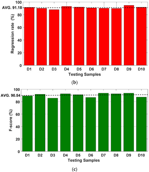 The training process comparison based on the damage identification test data for ten data sets of displacement. (a) Accuracy (). (b) Regression rate (). (c) F1-score ().