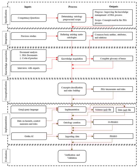 This section describes how the METHONTOLOGY steps were applied in the process of developing the Ontology for Job Hazard Analysis Knowledge Graph (O-JHAKG). Figure 1 overviews the overall development process with inputs, process, and outputs involved at each phase. The following subsections provide a detailed description of each phase this research followed.