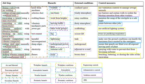 The analysis of JHA documents revealed the characteristics of job steps and their different relationships with hazards. In JHA documents, job steps are normally expressed as a combination of (i) act (e.g., excavating, welding, painting, cutting, and compacting), (ii) execution method (e.g., mini excavator, gas welding, spray painting, oxy-acetylene torch, and rammer), and sometimes (iii) the materials associated with the job step (e.g., asbestos sheet, sewage water pipe, and socket outlet). All these three elements of the job step can relate to a particular hazard. Following this, in O-JHAKG, the job step concept is expressed as a combination of an act, executing methodology, and the associated material: (job step)—owns → (act), (job step)—owns → (execution method), (job step)—owns → (materials). Therefore, as shown in Figure 4, the taxonomy of a job step includes the concepts of act, execution method, associated material, and external conditions.