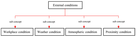 Construction workers perform their duties under different conditions. Those conditions can be broadly divided into four main categories namely: workplace, proximity, weather, and atmosphere as illustrated in Figure 5. Other than the hazards resulted as a direct execution of job steps, these conditions can also create hazards to the workers. Thus, the JHA process needs to consider these external conditions as well to get an overall picture of the hazards that can impact the workers. Moreover, these external conditions can create influences on the risk of hazards by altering the probability (this is further explained in Section 4.4.5, under “Rules Related to Risk Evaluation”). Thus, incorporating the concepts of external conditions is vital for the performance and the comprehensiveness of JHAKG.
