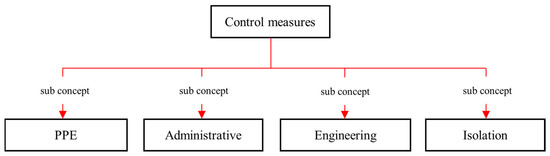 Authoritative sources of risk management principles explain that control measures are categorized into six categories such as elimination, substitution, isolation, engineering controls, administrative controls, and personal protective equipment (PPE) [40,41]. The JHA document analysis revealed that out of the six categories, JHA considers only the last four types of control measures. It is because the first two types of risk control measures, elimination and substitution, can be considered only in the early stages of the construction project when construction methods are determined. Therefore, when it comes to the construction phase, choosing an elimination or substitution type of control measure is nearly impossible as it would require a major change in the whole process of construction or in the construction design. Therefore, it is more plausible to consider a control measure among the last four types, and therefore O-JHAKG includes these four types of control measures as the sub-concepts of control measures, as shown in Figure 7. The formalization of the type of control measures in this way allows the JHA results to clearly indicate the type of control measures, thereby the power of control.