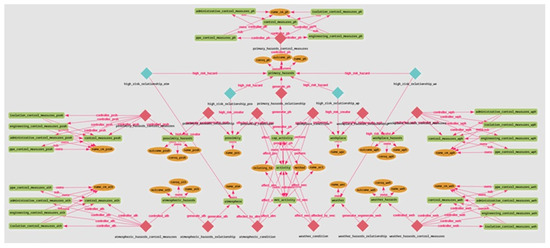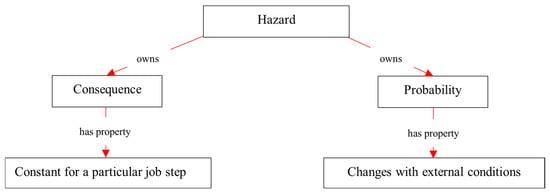 As explained previously, the risk of a hazard is related to two concepts, probability and consequence. In O-JHAKG, the consequence of a hazard is defined as a constant characteristic, meaning the consequence is the worst possible result of the accident originating from the hazard. Thus, the consequence would not be affected by external conditions when the job step is the same. On the other hand, the probability of a hazard (meaning the probability that an accident occurs due to the hazard) can be changed by external conditions under which the job step is executed. For example, the probability of an asphyxiation accident is higher when welding is performed in a confined workplace than in an open environment, and thereby an increased risk. These relationships between the risk of hazard and external conditions were identified through document analysis and expert interviews, and they are coded as a rule as part of O-JHAKG, as shown in Figure 8. This means that certain relationships between some external conditions and the probability variable for some hazards can be entered in the form of a rule in JHAKG (as discussed in the implementation section, the graph database management system used for this research allows this kind of formalization).