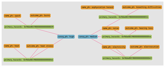 Figure 10 and Table 5 show the result of the query in the form of a graph and tabular form. As shown in the figure, the knowledge graph was able to extract five different hazards associated with the arc welding process and to retrieve their outcomes with consequence levels. Therefore, safety personnel can prioritize the hazards and treat them according to their consequence level.