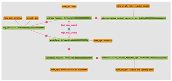 The result of this query indicates that when arc welding is performed in a manhole, the risk of heat can be increased due to the enclosed nature of the work environment. The arrows starting from the green dot in Figure 13 indicate a high-level risk. Additionally, this query returns the control measures to mitigate this high risk of heat stress and the control measures to mitigate the risk arising from the workplace characteristics in their respective category. Table 8 show the results of the query in the tabular form.