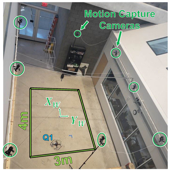 All tests were conducted at the Robot Fly Lab in the University of Michigan Ford Motor Company Robotics Building. This indoor flight arena is equipped with eight OptiTrack motion capture cameras with a working volume of 4 m × 3 m × 2.25 m as shown in Figure 2. A ground station computer connected to the OptiTrack system provides ground-truth position and attitude estimates of the vehicle at 120 Hz. The communication setup for the ground station, pilot transmitter, and flight vehicle is the same as that depicted in Figure 3 of [9], but with one less BeagleBone Blue on the UAV.