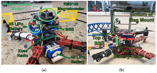 Figure 3b shows Q1 with different distances from the magnetometer to the rest of the vehicle’s electronics. is defined as the distance from the top of the battery mounting plate to the top of the BBB. This distance is = 4.79 cm on Q1 and will not change in any experiments through this paper. is an adjustable distance defined from the top of the BBB to the bottom of the magnetometer’s mounting plate that allows us to investigate how the magnetometer’s proximity to other electronics affects the consistency of magnetic field measurements on a quadrotor.