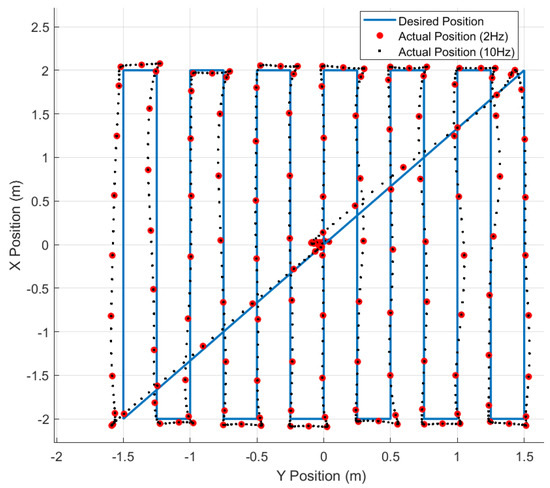 Our flight tests are designed around single-altitude scanning patterns that gather observations at a planar slice of the working volume. Figure 4 shows the desired trajectory (solid blue line) has 4 m x-axis strides separated by 0.25 m y-axis strides. Since all flights begin at the origin (0 m, 0 m), the trajectory in Figure 4 includes diagonal strides to leave and return to the origin at the start and end of each flight test. Finally, some trajectories gather observations at multiple altitudes in a single flight and include z-axis strides between each planar trajectory. For multi-altitude tests, the drone traverses a single diagonal stride from the origin to the corner at the first altitude and another diagonal stride from the corner to the origin at the final altitude.