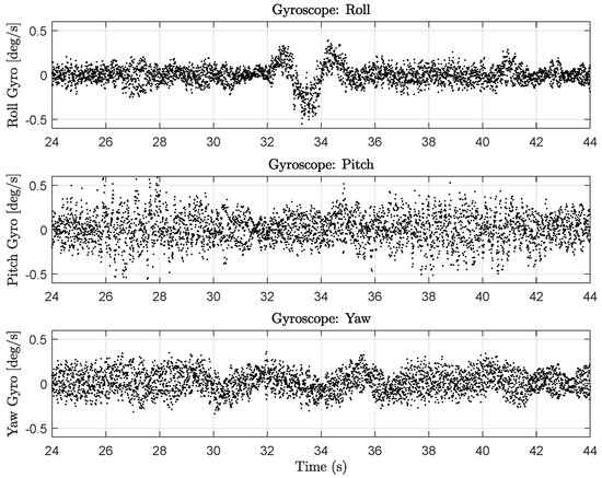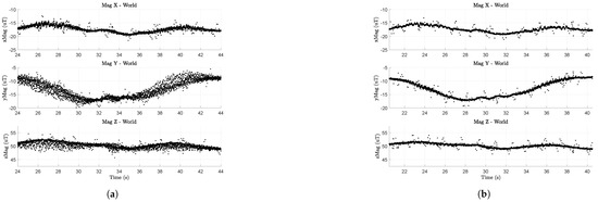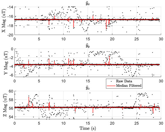 Figure 5 shows data from the UAV’s RM3100 for a segment of time when the drone is not moving, and the motors are not spinning. The black dots are raw magnetometer measurements with many spurious measurements that vary by T for each axis, respectively. We have seen such spurious measurements from three different RM3100 sensors, even one mounted on a platform with no motors or ESCs (electronic speed controllers). Other works using RM3100s did not report such spurious readings [15,37]. Thus, we believe this could be a result of the 200 Hz sampling rate (600 Hz for the whole device to achieve 200 Hz per axis) or something to do with the RM3100’s firmware. Alternatively, this may stem from poor voltage regulation on the BeagleBone Blue. We have not tried sampling from other microprocessors to see if the BeagleBone is the root cause.