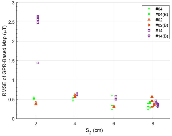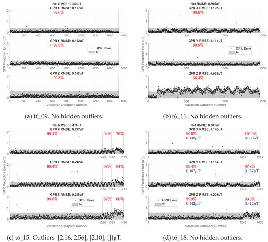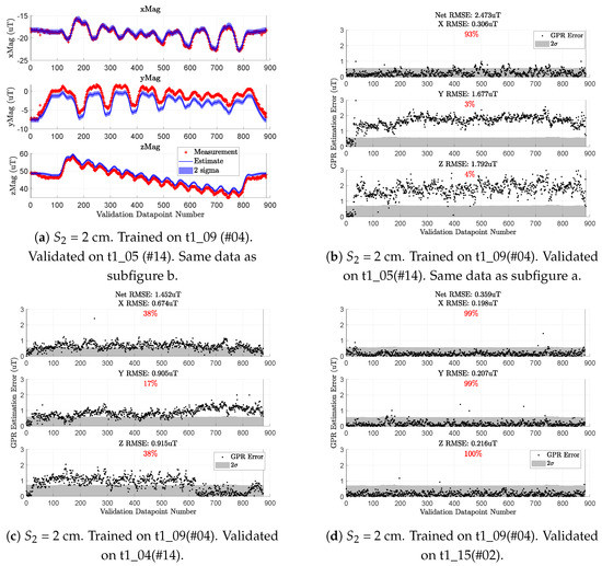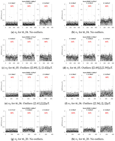 Our preliminary results on magnetic field position localization show that the errors in t6_15 (Figure 13c) and t6_18 (Figure 13d) are enough to confuse a particle filter and cause noticeably larger estimation errors. The use of GPR-based magnetic field maps for position localization (via a particle filter) drove the methods throughout this paper and influenced our consistency check threshold. However, if the intended application is more robust to “small” inaccuracies of the map, then a more lenient threshold may work.