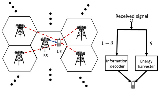 where and are the nonlinear model parameters, and is the transmission power for the ith device on the jth sub-carrier with the assumption that the noise power is negligible [30,31]. Following the model without its assumption, this work considers as the channel between UE i and BS j on the same frequency band as shown previously, and in terms of these notations, the energy harvested through the split part for EH would be denoted by