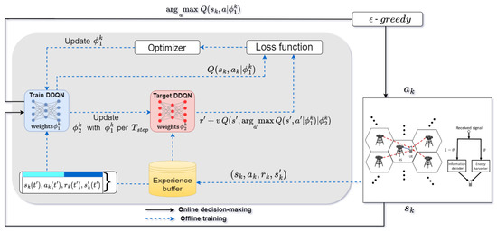 To this end, the proposed DDQN algorithm is conducted to follow the concept of DTDE as shown in Figure 2, wherein each agent k takes its action based on its current state obtained from the information exchanged among its neighbors, representing the concept of distributed executing (DE). In addition, each agent k trains its own DNNs, and , by using the experiences stored in its replay buffer , representing distributed training (DT) in this algorithm. Specifically, the main MDP components for the proposed DDQN algorithm are summarized as follows: