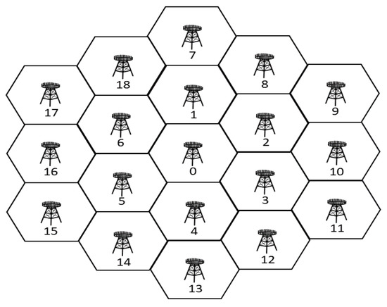 As an example shown in Figure 1, the downlink wireless network in question is composed of L cells, and, in each cell, there is a BS equipped with antennas to transmit to a single-antenna IoT-UE (or UE for short in the sequel). In fact, each cell can support multiple UEs by using orthogonal frequency bands; thus, no intra-cell interference is considered here. However, as noted previously, a frequency band shared by all the cells involved is possible, and inter-cell interference would be concerned. Consequently, when focusing on a frequency band adopted, we can model the channel of this system as multi-cell MISO-IC, in which the received signal at the UE associated with i-th BS (or say, direct link i) at time t can be formulated as