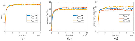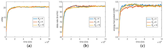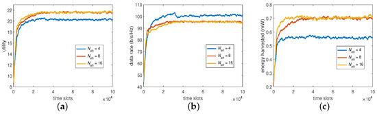For the second part of BP, the beam direction, we set the codebook to have 4, 8, and 16 vectors or directions, respectively, to see its impact on the system performance. The results are now summarized in Figure 5, showing that could produce a higher data rate to compensate for a lower harvested energy and that could obtain a higher harvested energy to compensate for a lower data rate when compared with that of . However, the trend is still the same in that increasing would provide similar utility as that on . This suggests that, despite the slight trade-off between the data rate and harvested energy, would be sufficient for the algorithm to converge for the desired overall utility without further increasing its learning overhead.