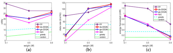 For these algorithms, we set , 0.5, and 0.9 in (10) to represent a “low”, “middle”, and “high” weight on the data rate (or a “high”, “middle”, and “low” weight on the harvested energy), and we examined the performance differences on these weights applied to these algorithms. Their results are summarized in Figure 7. Specifically, in Figure 7b,c, the random algorithm, which randomly chooses BP from the codebook despite W is shown to retain the same performance on these metrics, as expected. Similarly, given a non-zero W, each agent with the greedy algorithm chooses the best BP for its data rate despite the harvestable powers from the others, which are out of its control on BP, and this is also shown to remain the same on the two metrics when varying the weight.