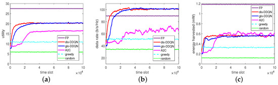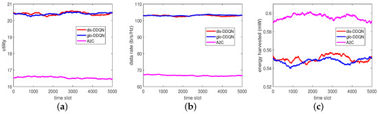 Test results of the RL-based algorithms: (a) utility, (b) data rate, and (c) harvested energy.