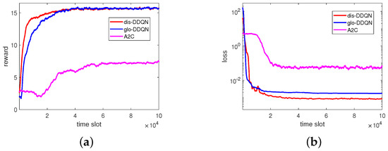 - Global state information-based scheme: In principle, this scheme is the same as the distributed multi-agent DDQN algorithm. However, instead of adopting its own state only, each agent k adopts the full state information, i.e., for its own DDQN operations, based on the concept of centralized training distributed executing (CTDE). Clearly, collecting such information would require a centralized processor or a full information exchange mechanism to exist in the network and, thus, is denoted as “glo-DDQN” as noted at the beginning of this section.