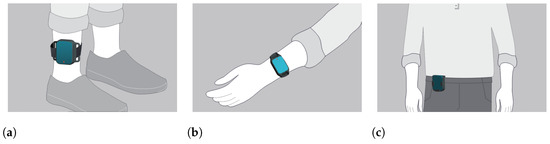 Placement of the wearable IMU-based monitoring devices. (a): Placement of ankle sensors. (b): Placement of wrist sensors. (c): Placement of the waist sensor.