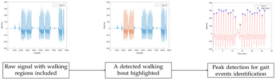 IMU-based gait region identification. In the first plot, the initial signal is shown. For the detection of gait events in the specific dataset, the gyroscope’s Z-axis signal was employed. Next, in the second plot, the result of the procedure for the detection of walking bouts appears, with the region of interest highlighted. In our work, the regions were extracted manually. Finally, in the third plot, the results of the peak detection method can be seen. The peak detection method was used to identify gait events.