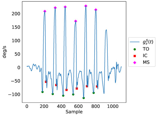 - The toe-off (TO), identified using peak detection based on the inverted Z-axis signal of the gyroscope (), with a fixed threshold, as follows: