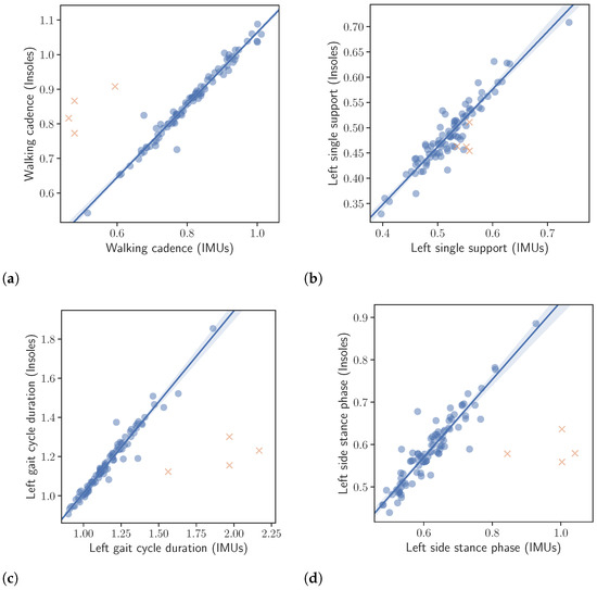 Correlation between the extracted gait kinematic features from the data of the instrumented insoles and the IMU-based devices. Note that the orange crosses represent outliers. The outliers were not taken into account in the calculation of the regression line or the correlation values presented in the text. (a): Walking cadence. (b): Left single support. (c): Left gait cycle duration. (d): Left side stance phase.
