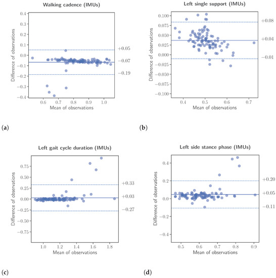 Bland-Altman analyses between the extracted gait kinematic features from the data of the instrumented insoles and the IMU-based devices. The upper and lower limits of the Bland-Altman analyses were calculated using the formula , respectively. (a): Walking cadence. (b): Left single support. (c): Left gait cycle duration. (d): Left side stance phase.