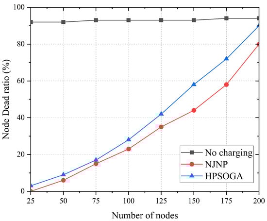 As depicted in Figure 7a,b, in 100, 150, and 200 nodes, the three different network sizes, we observe that node dead ratio and average charging latency are relatively high at the beginning at lower , and node dead ratio and average charging latency show decreasing trend as increases. The reason is that, when is too small, resulting in longer charging time, the residual energy of subsequent nodes rapidly decreases, leading to more nodes with insufficient energy, a sharp increase in charging requests, a sharp increase in node dead ratio, and a rapid increase in the average charging latency. With the gradual increase of , MC can replenish energy for nodes faster, with more energy remaining in subsequent nodes and shorter waiting time for charging, leading to a lower node dead ratio and average charging latency.