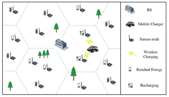 Wireless sensor networks (WSN) have gradually served as an essential infrastructure and have been widely used in modern defense, national health, intelligent transportation, environmental monitoring, and so on [1,2]. For a long time, however, the limited battery energy of sensor nodes has been a key factor in restricting the performance and popularization of WSN. Benefiting form the breakthrough of wireless charging technology, a novel and practical solution is to deploy charging systems for WSN to form wireless rechargeable sensor networks (WRSN) [3], which consist of one or more mobile chargers (MC) with high-capacity batteries, a base station (B), a service station (S) that can recharge MC, and lots of sensor nodes. The base station and the service station are usually at the same location, collectively known as BS. MC can move autonomously and is equipped with a wireless charging device to replenish energy for nodes by wireless charging to reduce the number of dead nodes.