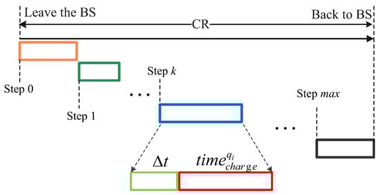 At the initial state, MC is in the service station. When MC is working, MC will select a charging cell to charge or will go back to S due to its low energy. As shown in Figure 4, during a CR, at step k, the state of WRSN is ; thus, MC determines action and executes it. MC obtains and next state after performing the action [17]. We assume that MC chooses to charge at step k; in the process of MC moving and charging the charging cell , the remaining nodes consume energy in the waiting process. After charging the charging cell , energy updates of nodes in the charging cell are as follows: