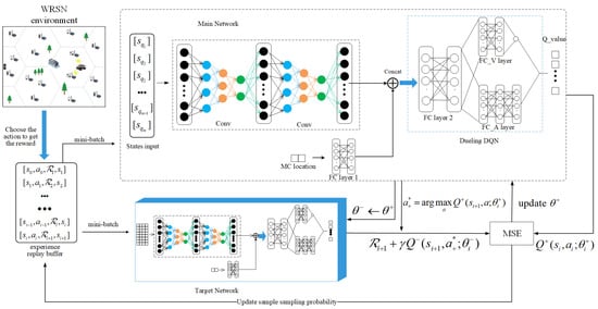 In WRSN, traditional RL is difficult to be applied to such problems because of the presence of large and high-dimensional data. However, deep learning has a powerful high-dimensional data processing capability. Therefore, RL can be combined with deep learning to form deep reinforcement learning with both high-dimensional continuous data processing capability and powerful decision-making capability, which can well solve the optimization problem of scheduling MC in WRSN. As shown in Figure 4, we have the following definition.