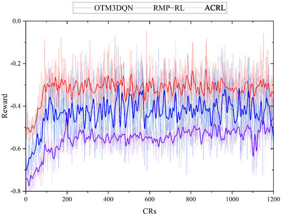 Training process average reward value for OTM3DQN, RMP-RL, and ACRL.