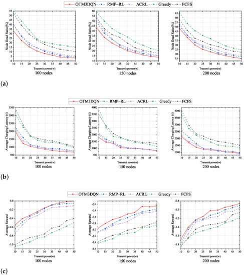We mainly talk about how MC transmitting power affects charging effectiveness. The movement speed of MC is fixed at 5 m/s. The value of uniformly increases from 10 w to 50 w. We count the number of dead nodes at the completion of each charging task of the MC and calculate the node dead ratio when MC returns to S. In Figure 7, we show the comparison results with OTM3DQN, RMP-RL, ACRL, Greedy, and FCFS in networks with different numbers of sensor nodes.