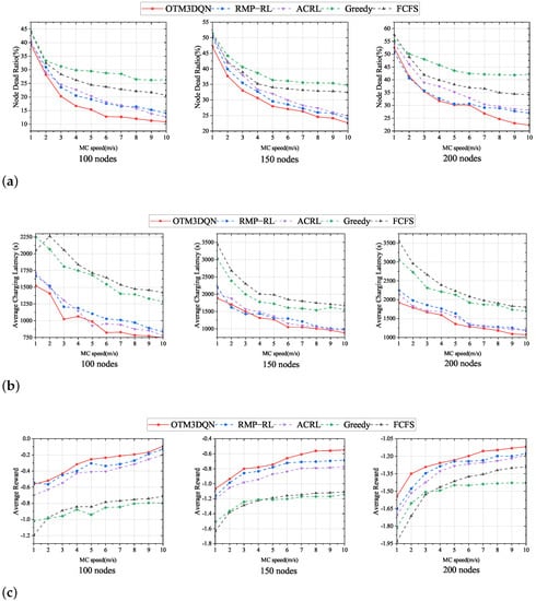 Impact of MC speed. (a) Node dead ratio under different MC speed. (b) Average charging latency under different MC speed. (c) Average reward under different MC speed.